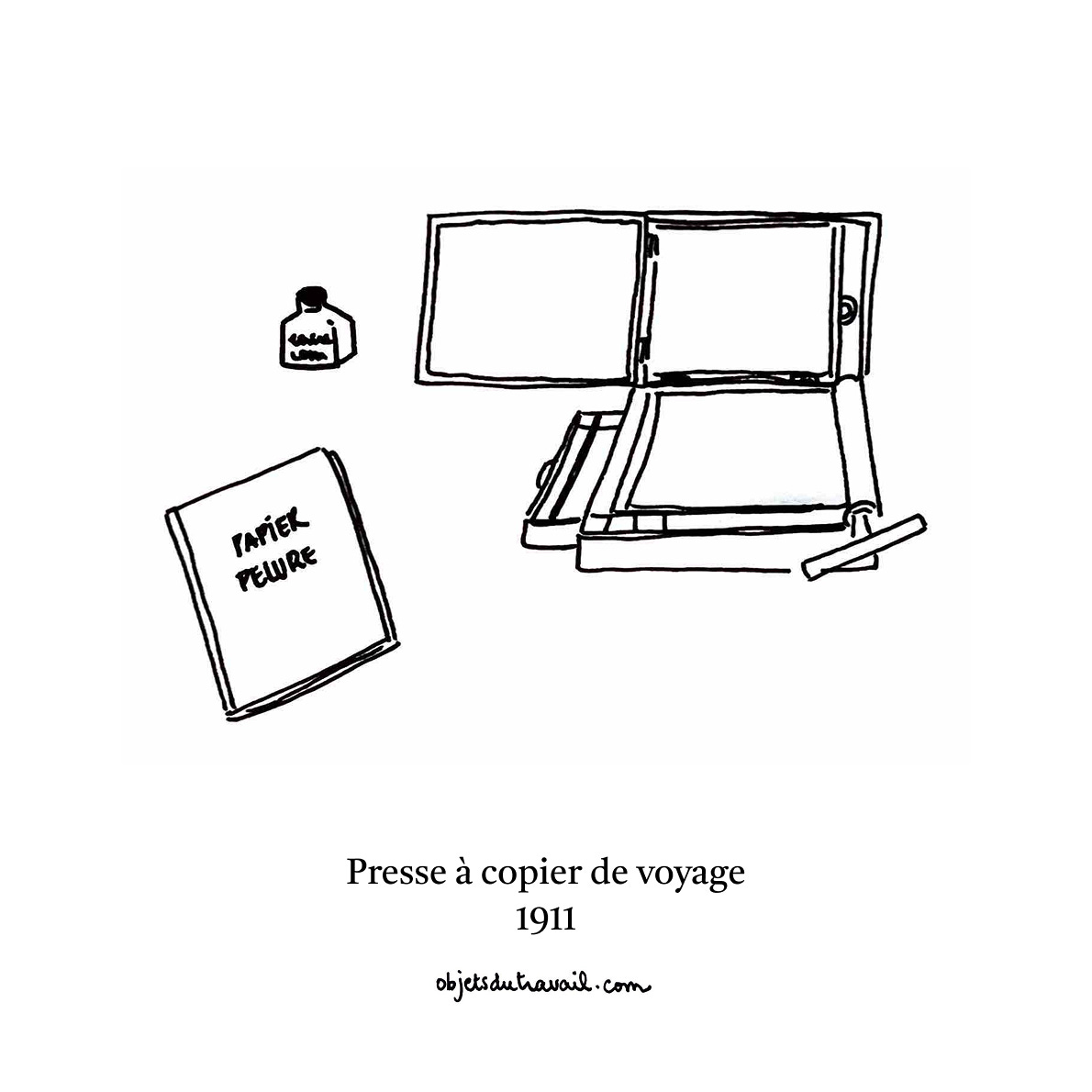 Les presses à copier, dont la propriété de l’invention revient à James Watt, permettent pour la première fois de l’histoire de l’humanité qu’une copie mécanique soit réalisée par n’importe qui, la rendant ainsi quotidienne. Ces copies diffèrent du procédé du copiste ou de l’imprimerie : il s’agit d’une copie quasi-photographique, elles transcrivent “l’image du texte” plus que le texte lui-même, inaugurant ainsi toutes les techniques de copie ultérieures. Pour fonctionner, l’original doit être rédigé à l’encre communicative (“Ces encres possèdent la propriété de transporter sur une feuille de papier mouillé les caractères tracés sur une feuille originale sans les effacer” peut-on lire sur les publicités de l’époque), puis pressé contre du papier pelure légèrement humecté, protégé d’un papier huilé ou paraffiné (trop fan de ces termes tous plus poétiques les uns que les autres !).